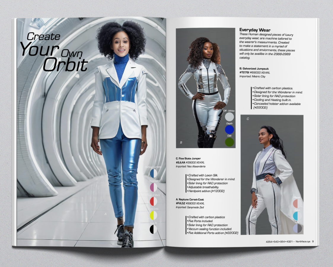 Using Generative AI tools (Adobe Firefly), I created futuristic garments that reflect the socio-political, technological, and ecological realities of an interstellar society. Rather than functioning as a neutral product showcase, the catalog is designed as an in-universe cultural artifact, where fashion serves as both storytelling device and speculative commentary on the world it inhabits.